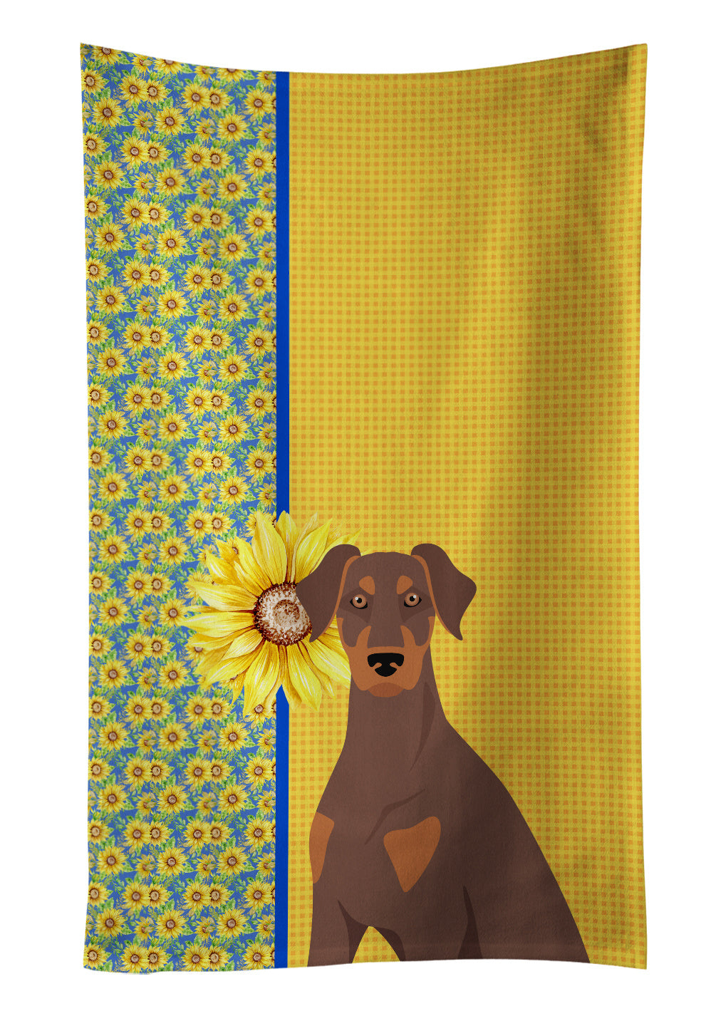 Kitchen Towel featuring breed specific Doberman Pinscher artwork. Add this colorful Kitchen Towel to decorate for Summer, This Kitchen Towel is from Caroline's Treasures collection Summer Sunflowers. Experience the perfect blend of aesthetic appeal and functional excellence with our Plush Velour Kitchen Towels. These are not your ordinary decorative kitchen towels that gather dust. Instead, they are designed to be as practical as they are stylish. The front layer of our towel is constructed from a minky plush polyester, known for its durability and color retention. Unlike conventional kitchen towels, the artwork on our towels is dyed directly into the fabric, ensuring vibrant colors that last. Polish your glassware to a brilliant sparkle using the plush front side of the towel. Flip to the back, crafted from 100% cotton terry loop, to exploit its exceptional absorbency for drying dishes or wiping down counters. Our kitchen towels redefine the concept of functional art, offering lasting quality that maintains the towel's shape over time. Measuring 15 inches by 25 inches and weighing 2.3 lbs per dozen, these towels deliver an overwhelming sensory experience with their soft, plush, and smooth texture. The edges are meticulously finished with binding, enhancing their durability and visual appeal. For your convenience, these towels are machine washable and can be dried on low heat. After the first wash, the top fabric becomes even softer and fluffier, eliminating the need for ironing. Treat your kitchen to the luxury and functionality it deserves with our plush velour kitchen towels. This Kitchen Towel is from Caroline's Treasures Dogs category of products.