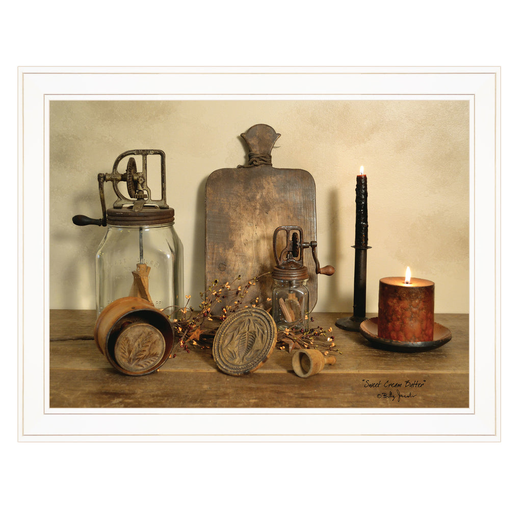 BJ1013XGP-226G "Sweet Cream Butter" a framed Giclee print by artist Billy Jacobs, in a stylish (27x21) white frame. This still life art features antique items related home made butter, all arranged on a wooden table against a neutral wall. There are 2 different antique glass jar, hand crank butter churns, several vintage wooden butter molds, and a large cutting board, all lighted by a couple pillar candles. This framed art is totally American made. The surface of the art is coated with a fade resistant texture which gives it a canvas-like appearance. No glass is necessary. Arrives ready to hang. About "Giclee prints": With giclee's the inks are actually sprayed into place similar to an ink jet printer. Even under a magnifier there seems to be no dots! Giclee's also use specially made inks with true light fast pigments. This ensures that the artwork you purchase will retain its color. Independent laboratories have rated the inks to be fade resistant to 115 years. The giclee is basically the best available. •Print has fade resistant surface texture, no glass is necessary•Giclee print, highest quality print•Arrives ready to hang, no additional hardware needed on item•individually hand crafted by skilled American workers•frame mitered with precision equipment•Framed art with no glass for safety around children