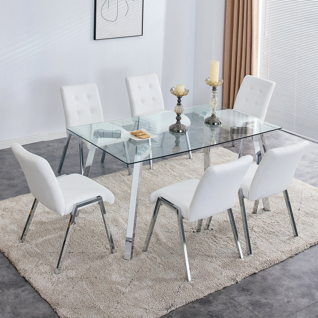 Table and chair set, 1 table with 6 white chairs. Rectangular glass dining table with tempered glass tabletop and silver metal legs. Paired with armless PU dining chairs and electroplated metal legs.