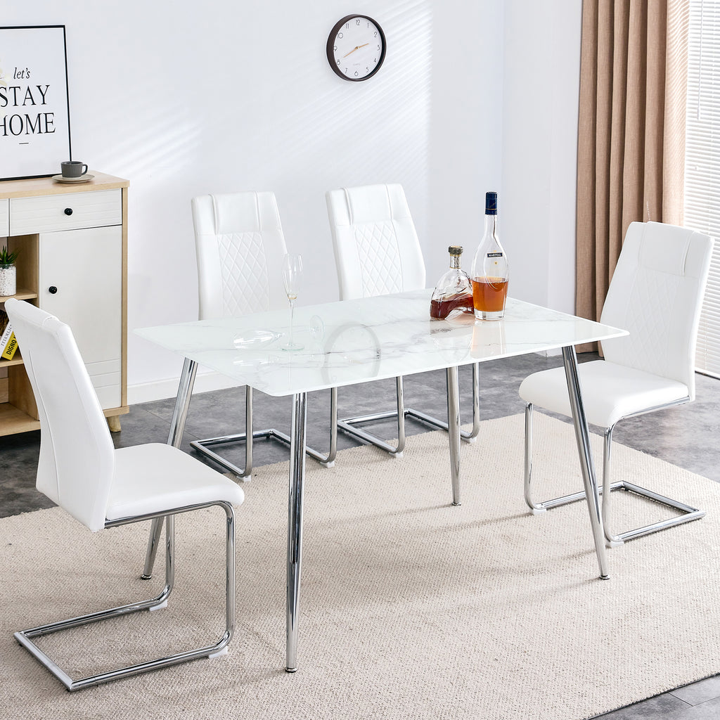 Table and chair set. 1 table with 4 white PU chairs. Modern minimalist rectangular glass dining table, with silver metal legs. Paired with 4 PU chairs.