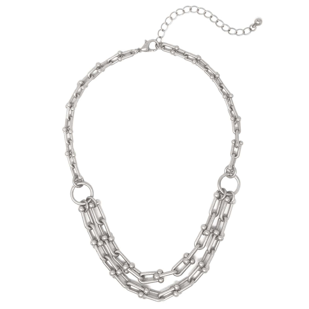 This designer inspired statement necklace offers a gracefully chic look with its unique link chain design. The Taylor Unique Link Chain Necklace features a worn gold/silver finish for an effortless, elegant look. Perfect for any occasion.