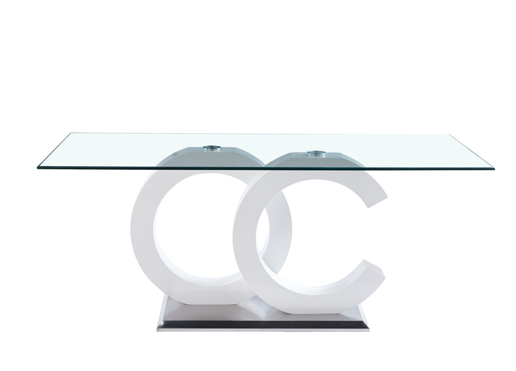 An ultramodern white dining table with a high gloss lacquer finish in a striking OC-shaped base will be the centerpiece of your contemporary dining room. The rectangular tabletop is made from 0.39 inches thick tempered glass, and the MDF double pedestal rests on a glossy rectangle stainless steel base for a balanced, modern profile. The stunning, sculptural look of the table brings a sophisticated attitude into your home.