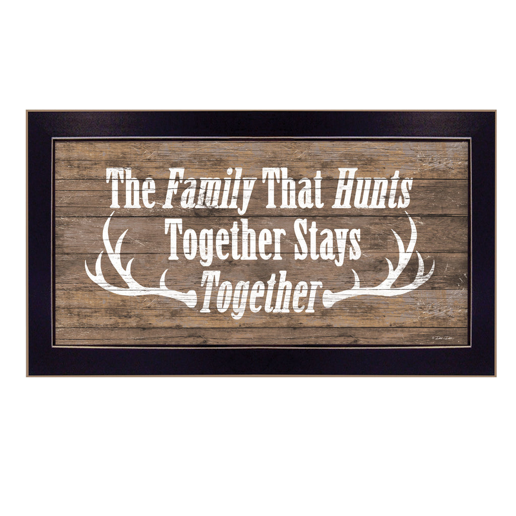 DD1419 "The Family that Hunts" is a 20" x 11" print in a decorative black frame designed by Dee Dee. It shows antlers with text "The family that hunts together stays together". The print has a protective, archival finish (glass is not needed) and arrives ready to hang. Made in the USA with pride by skilled American workers.•Women Owned (WBE)•Textured Artwork with a 'rolled on' acid free acrylic coating to create a canvas painting effect. No glass is necessary.•UV protectant coating protects artwork from fading.•Arrives Ready to Hang