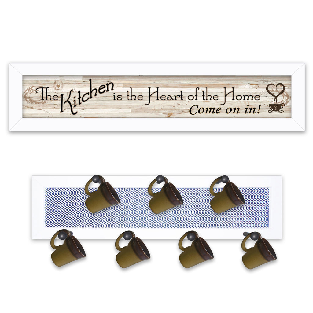 V431-MPH-712W The Kitchen Vignette, a 2 piece grouping by the designers at Trendy decor 4U, in matching white frames: Mug Rack (26 x 7) with 7 pegs (mugs not included); Framed Print: "Kitchen is the Heart of the Home" (32 x 7) works great over doorways and windows. The mug rack can hang horizontal or vertical and can hang 7 mugs, or be inventive and display towels, key rings or double strung candles. The surface of the print is textured with a fade resistant coating so no glass is necessary. Arrives ready to hang. Made in the USA by skilled American workers. •TEXTURED ARTWORK with a 'rolled on' acid-free acrylic coating to create a canvas painting effect.•UV PROTECTANT COATING protects artwork from fading. No glass is necessary.• MOULDING adds natural beauty to the framed art. Frame is keyholed for the easy hanging.•THIS FINE HOME DECOR piece made in the USA by Woman Owned Business (WBE) is a perfect gift for a friend or relative.