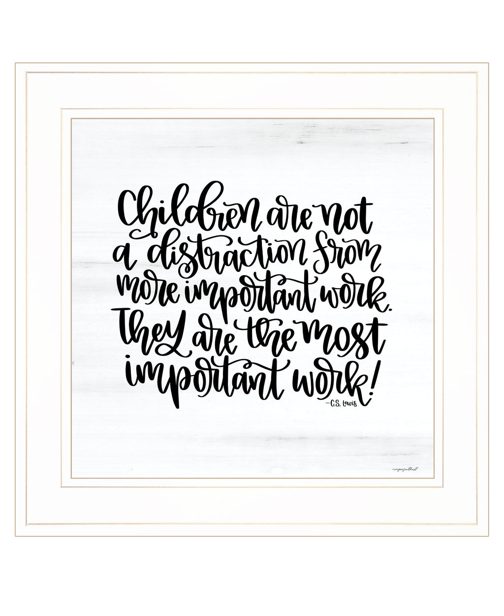 "The Most Important Work" is by Artisan Imperfect Dust. This 15"X15" decorative white framed wall art. This simple typography image is overlaid on top of a shiplap background with the script reading "Children are not a distraction from more important work, They are the most important work.". Our products are proudly made by skilled American workers. The surface of our framed art is textured with a fade resistant coating, so no glass is necessary. A vegetable-based glue is used in the production of our products, and our frames are crafted from 100% recycled material. In keeping with our environmentally friendly approach towards manufacturing. Arrives ready to hang.•Print has fade resistant surface texture, no glass is necessary•Woman Owned Business (WBE)•Arrives ready to hang, no additional hardware needed on item•individually hand crafted by skilled American workers•Cleaning Instructions: Clean with Soft Dry Cloth Only•Made in U.S.A.•Artwork by American Artist
