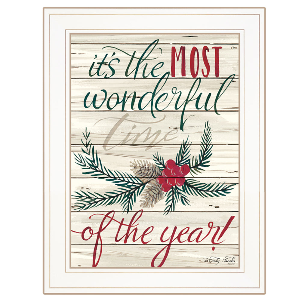 CIN621-226G "The Most Wonderful Time" is by artisan Cindy Jacobs this perfect Christmas decorative white framed wall art 15"x19" is perfect for any location. The shiplap background accents the print by bringing out the green and red script "it's the most wonderful time of year". The way the pine branches and pinecones are arranged in the center of the print give it a decorative feel. This is a perfect accent to any Christmas decor. Our products are proudly made by skilled American workers. The surface of our framed art is textured with a fade resistant coating, so no glass is necessary. A vegetable-based glue is used in the production of our products, and our frames are crafted from 100% recycled material. In keeping with our environmentally friendly approach toward manufacturing. •Print has fade resistant surface texture, no glass is necessary•Woman Owned Business (WBE)•Arrives ready to hang, no additional hardware needed on item•IndIvIdually hand crafted by skilled AmerIcan workers•Clean with Soft Dry Cloth Only