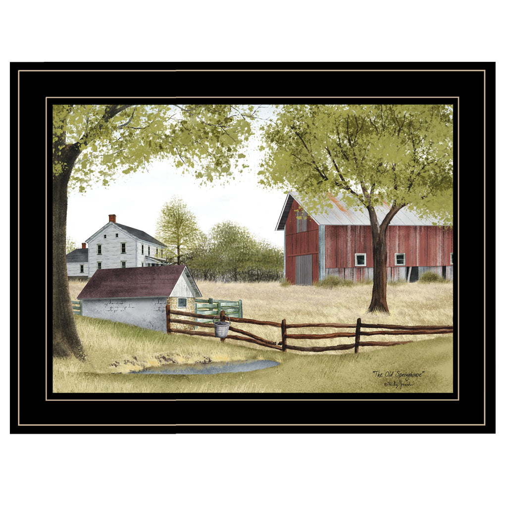 BJ217-704G "The Old Spring House" by artist Billy Jacobs, in a stylish 19" x 15" black frame. This pastoral theme art features a farm house, red barn, and a primitive wooden fence leading up to the old spring house, adjacent to a natural wet lands area of the farm. Two trees in summer foliage round out this art which is reminiscent of a by gone era when refrigeration was scarce. This framed art is totally American made. The surface of the art is coated with a fade resistant texture which gives it a canvas-like appearance. No glass is necessary. Arrives ready to hang.•Print has fade resistant surface texture, no glass is necessary•Woman Owned Busines (WBE)•Arrives ready to hang, no additional hardware needed on item•individually hand crafted by skilled American workers•frame mitered with precision equipment•Framed art with no glass for safety around children