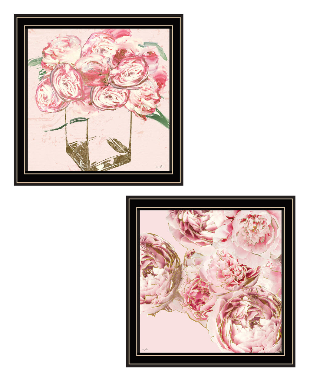 "The Peonies Collection" Vignette is by Artisan Sophie 6. This 2-14"X14" decorative black framed wall art. The set of images is of two arrangements of pink peonies which are gold outlined. The arrangement laid on top of a pink background and arranged in a way to show off all the angles of the flowers. Our products are proudly made by skilled American workers. The surface of our framed art is textured with a fade resistant coating, so no glass is necessary. A vegetable-based glue is used in the production of our products, and our frames are crafted from 100% recycled material. In keeping with our environmentally friendly approach towards manufacturing. Arrives ready to hang.•Print has fade resistant surface texture, no glass is necessary•Woman Owned Business (WBE)•Arrives ready to hang, no additional hardware needed on item•individually hand crafted by skilled American workers•Cleaning Instructions: Clean with Soft Dry Cloth Only•Made in U.S.A.•Artwork by American Artist