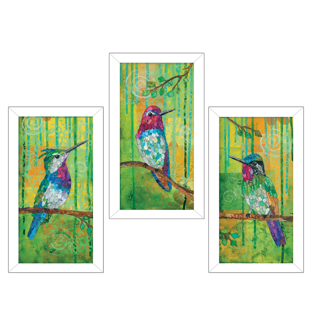 Three Hummers' is a set of (3) 8" x 14" framed art prints of the art of Lisa Morales. The set includes three different brightly colored hummingbirds in a decorative style. The prints have a protective finish, so no glass is needed, and arrive framed and ready to hang. They are made with pride in the USA.•Women Owned (WBE)•Textured Artwork with a 'rolled on' acid free acrylic coating to create a canvas painting effect. No glass is necessary.•UV protectant coating protects artwork from fading.•Arrives Ready to Hang