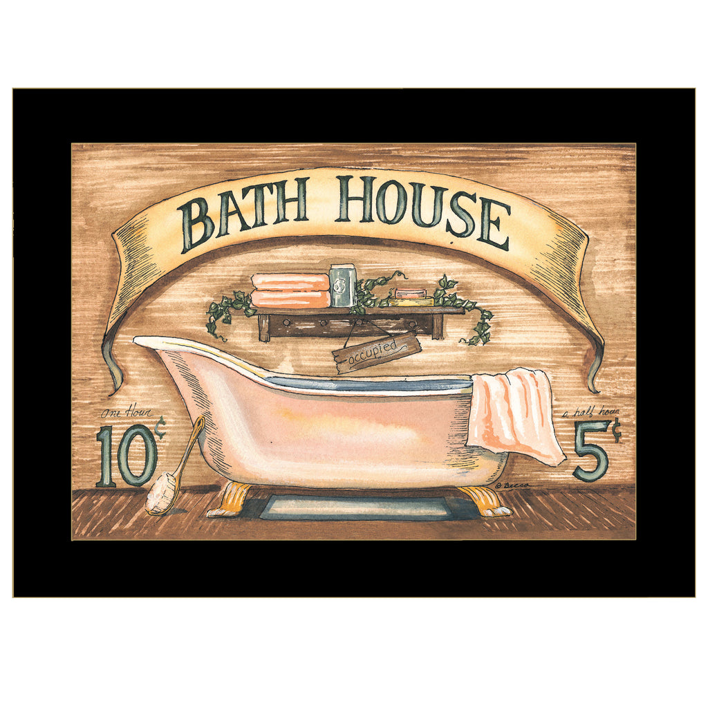 BB98-712 "Time To Relax" by Artisan Becca Barton. This decorative black framed 1-pc(18x14) of bathroom prints; old primitive claw foot bath tub, says" Bath House" just makes you relax! shelf of towels, bath soap, floral, soap everything you need to relax and enjoy. This framed art is totally American made. The surface of the art is coated with a fade resistant texture which gives it a canvas-like appearance. No glass is necessary. Arrives ready to hang.•Women Owned (WBE)•Textured Artwork with a 'rolled on' acid free acrylic coating to create a canvas painting effect. No glass is necessary.•UV protectant coating protects artwork from fading.•Molding adds natural beauty to the framed art. Frame is keyholed for ease of hanging.•Frame is keyholed for ease of hanging.
