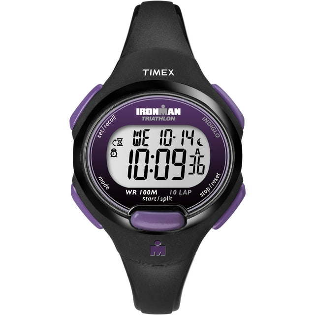 Black & purple 34mm resin case with acrylic lens; gray digital display; Indiglo light-up watch dial