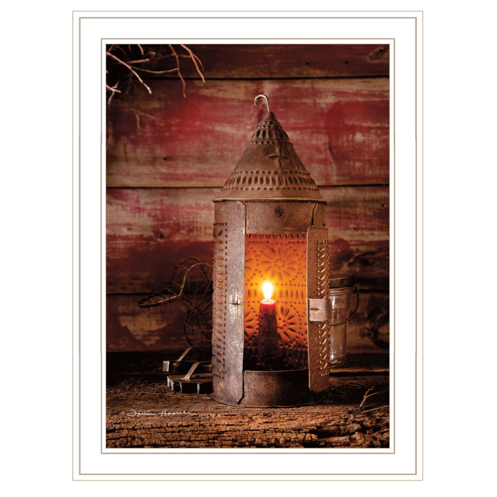 HOO125-226G "Tinner's Lantern" by artisan Irvin Hoover. This decorative white framed 1-pc.(15x21) of old time tin-punched Lantern's. These are what the innkeeper would have carried around to show you to your room. Framed prints by Irvin Hoover portfolio, very educated in the primitive style paintings. Framed print has a UV coating (glass is not needed) and arrives ready to hang. Made in USA. •Women Owned (WBE)•Textured Artwork with a 'rolled on' acid free acrylic coating to create a canvas painting effect. No glass is necessary.•UV protectant coating protects artwork from fading.•Molding adds natural beauty to the framed art. Frame is keyholed for ease of hanging.•Frame is keyholed for ease of hanging.