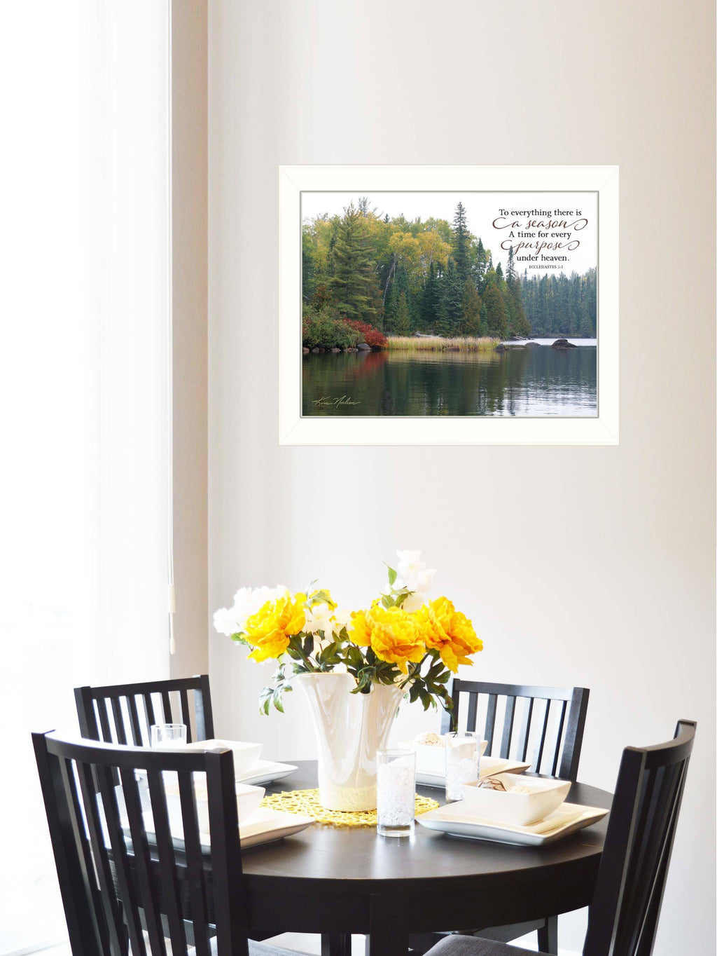 NFA235A-712W To Everything There is a Season by artist Kim Norlien, in a decorative 18 x 14 white frame. The script on the print is from the Bible, Ecclesiastes 3:1, shown with a background along a river, lined with trees. The surface of the print is textured with a fade resistant coating so no glass is necessary. Arrives ready to hang. Made in the USA by skilled American workers. •TEXTURED ARTWORK with a 'rolled on' acid-free acrylic coating to create a canvas painting effect.•UV PROTECTANT COATING protects artwork from fading. No glass is necessary.• MOULDING adds natural beauty to the framed art. Frame is keyholed for the easy hanging.•THIS FINE HOME DECOR piece made in the USA by Woman Owned Business (WBE) is a perfect gift for a friend or relative.