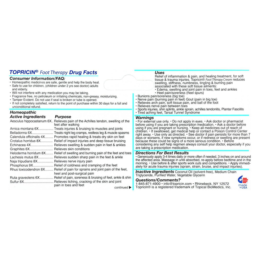 Topricin foot therapy cream is a non-greasy homeopathic cream that does not contain fragrance, petroleum, irritating chemicals or parabens. Our cream comes in a 2 oz. Tube and is formulated specifically for the relief of inflammation, swelling, soreness and pain in feet and ankles. See label for warnings and risks.