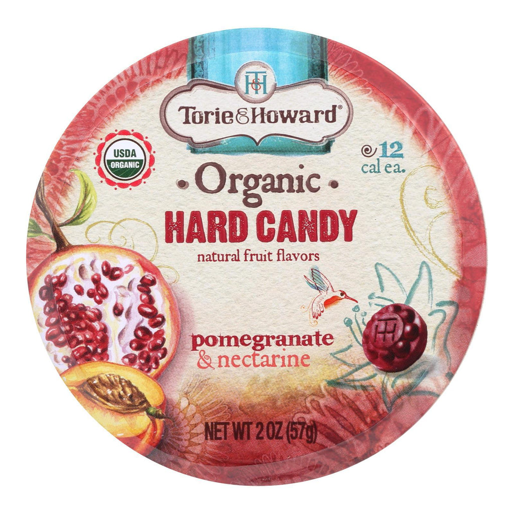 Torie & howard pomegranate & nectarine hard candy is made with natural ingredients. Each 2 oz. Tin contains pomegranate & nectarine flavored hard candies with only 60 calories per 5 piece serving. Our candies are made with natural fruit flavors and no corn syrup, artificial colors or casein. See nutrition panel for allergen information.