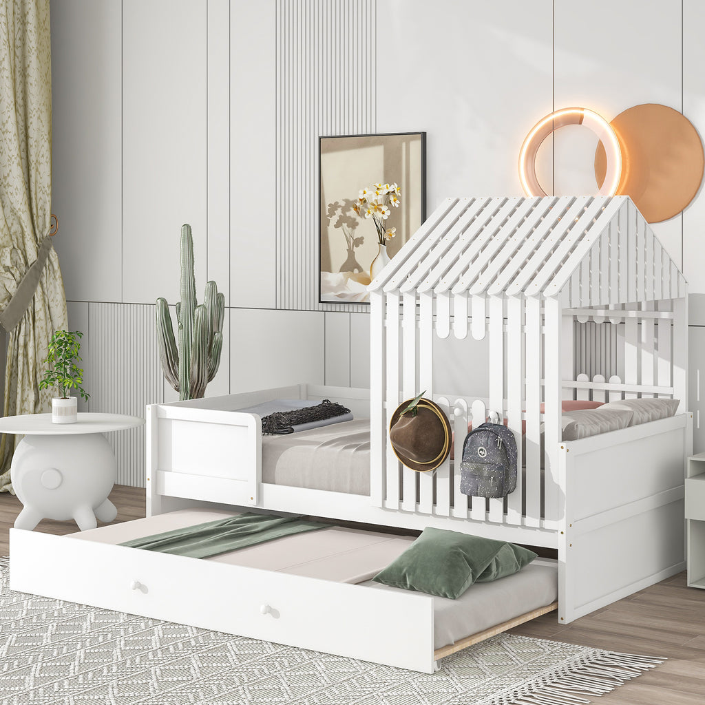 This house bed is designed with a roof, window and chimney to create a rustic atmosphere. Not only provides a practical sleeping space, but also a fashionable and interesting decoration. It can double as a semi-enclosed playground, which is very suitable for you to study, watch TV or explore their imagination.With full-length guardrails and sturdy pine wood frame, provide a safe space for your children to sleep well.The trundle provides you with extra sleeping space, suitable for families with many family members.①[House Shape] The platform bed comes with shape of the eaves, the whole bed like a house which enhances sleep comfort.②[With Trundle] The trundle underneath the bed provides you with extra sleeping space, suitable for families with many family members.③[Solid Construction] Made of high-quality pine wood and MDF to enhance the load-bearing capacity. Use paint finish to prevent daily wear and tear.④[Unique Style] Not only provides a practical sleeping space, but also a fashionable and interesting decoration. It can double as a semi-enclosed playground, which is very suitable for you to study, watch TV or explore their imagination.⑤[Easy Assembly] All parts, tools and instructions are shipped straight to your door in one efficiently packed box for simple set-up that takes less than an hour with a friend's help.
