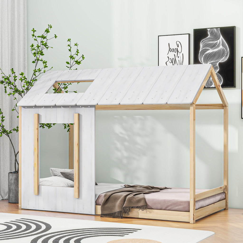 Twin Size House Platform with Roof and Window, White+Natural