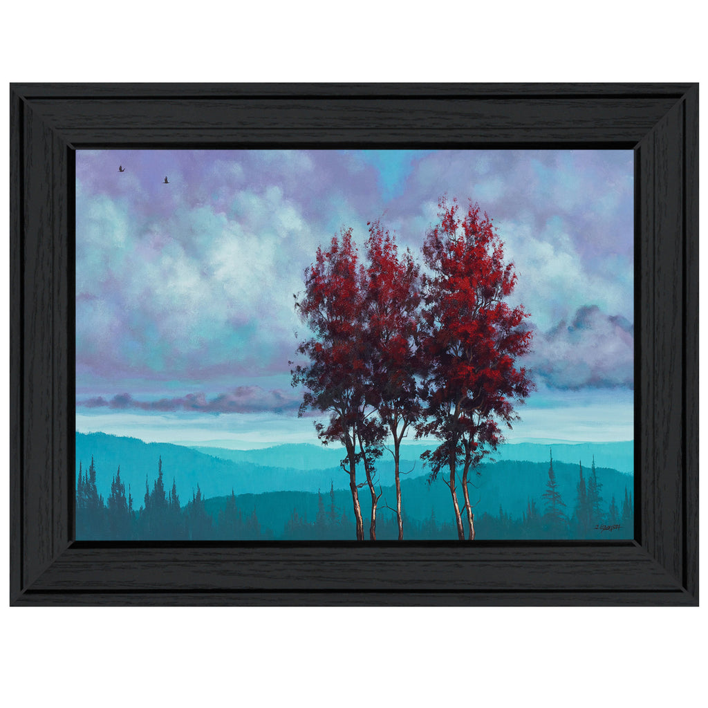 "Two Red" Trees by artist Tim Gagnon. This decorative black framed print 21"x15" of red maple trees in the fore-ground; and mist covering all the trees & mountain in the background. Framed print has a UV coating (glass is not needed) and arrives ready to hang.•TEXTURED ARTWORK with a 'rolled on' acid-free acrylic coating to create a canvas painting effect.•UV PROTECTANT COATING protects artwork from fading. No glass is necessary.• MOULDING adds natural beauty to the framed art. Frame is keyholed for the easy hanging.•THIS FINE HOME DECOR piece made in the USA by Woman Owned Business (WBE) is a perfect gift for a friend or relative.
