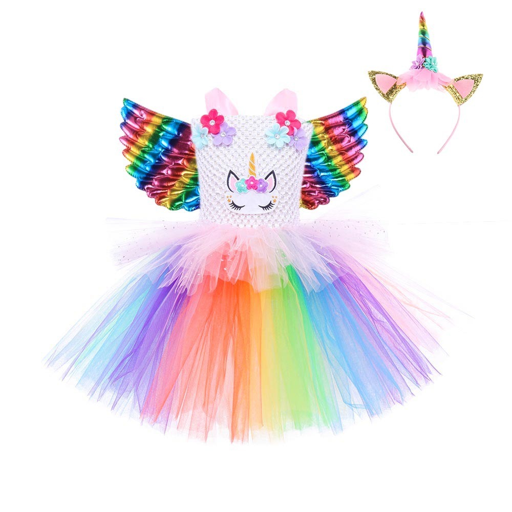 Girls Unicorn Tulle Dress Costume includes Wings, Unicorn Horn Headband, and Floral Rainbow Unicorn Tutu with 3D Flowers and Elegant Unicorn Shape Design on the Bodice.