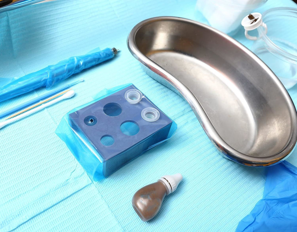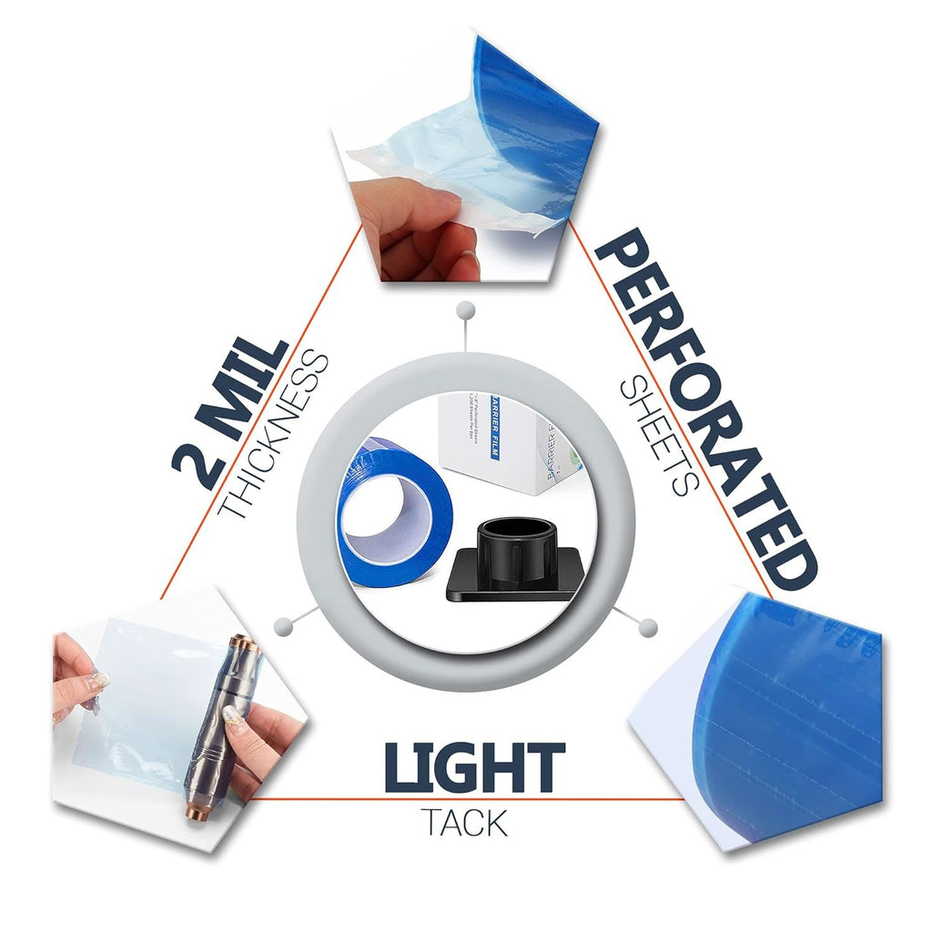 Disposable Blue Adhesive Barrier Films for Dental; Tattoo; Medical and Surgical Surface CoveringColor: Blue Material: Polyethylene Thickness: 2 mil Size of each sheet: 4 inch x 6 inch Quantity: 1200 plastic sheets per roll;  1 roll in dispenser box Our universal skin barrier film roll is a medical-grade plastic wrap with a self-adhesive backing and non-stick edges. Dental offices and other medical offices should be clean and sterile. Barrier film provides all-purpose control by protecting difficult-to-clean areas. Disposable blue barrier tape is ideal for wrapping around your materials;  protect various surfaces from impurities;  ink;  chemicals;  water and bodily fluids. These plastic film barriers for workspace are changed after each patient;  so surfaces remain clean and disinfected until the end of the day at the clinic. Rolls are perforated;  so it's easy to tear off single sheet or multiple sheets as needed. Easy to use by cutting it into 4' x 6' sheets (10.2 cm x 15.2 cm) that can be cut or molded into different shapes and sizes to fit the instruments or equipment they protect - water syringe handle covers;  hose covers;  pen sheaths;  etc.  Satisfaction Guarantee: We believe our products are the excellent quality we can offer to our customers to help them achieve perfect results. If for any reason you are not fully satisfied about the disposable protective barrier film roll with dispenser - just simply return it for a full refund or exchange.