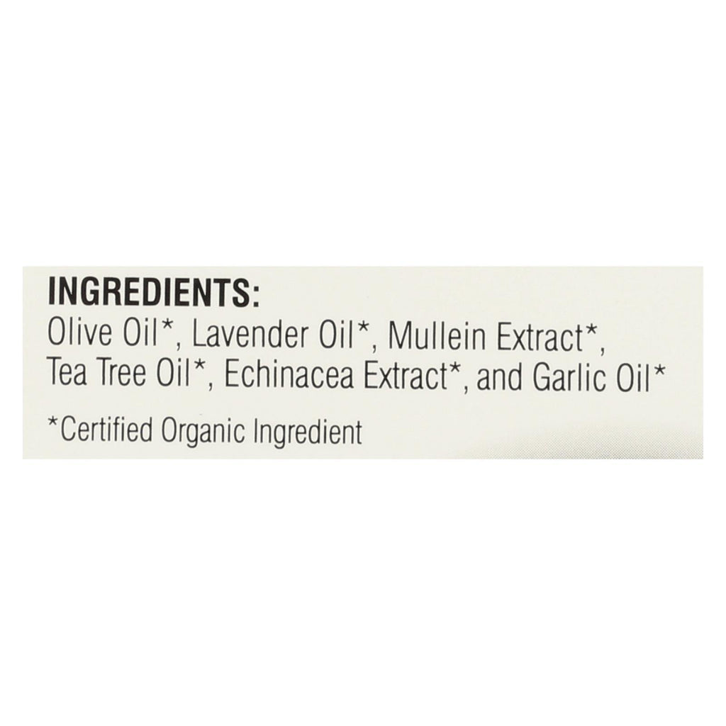 ingredients : olive oil;lavender oil;mullein extract;tea tree oil;echinacea extract;and garlic oil