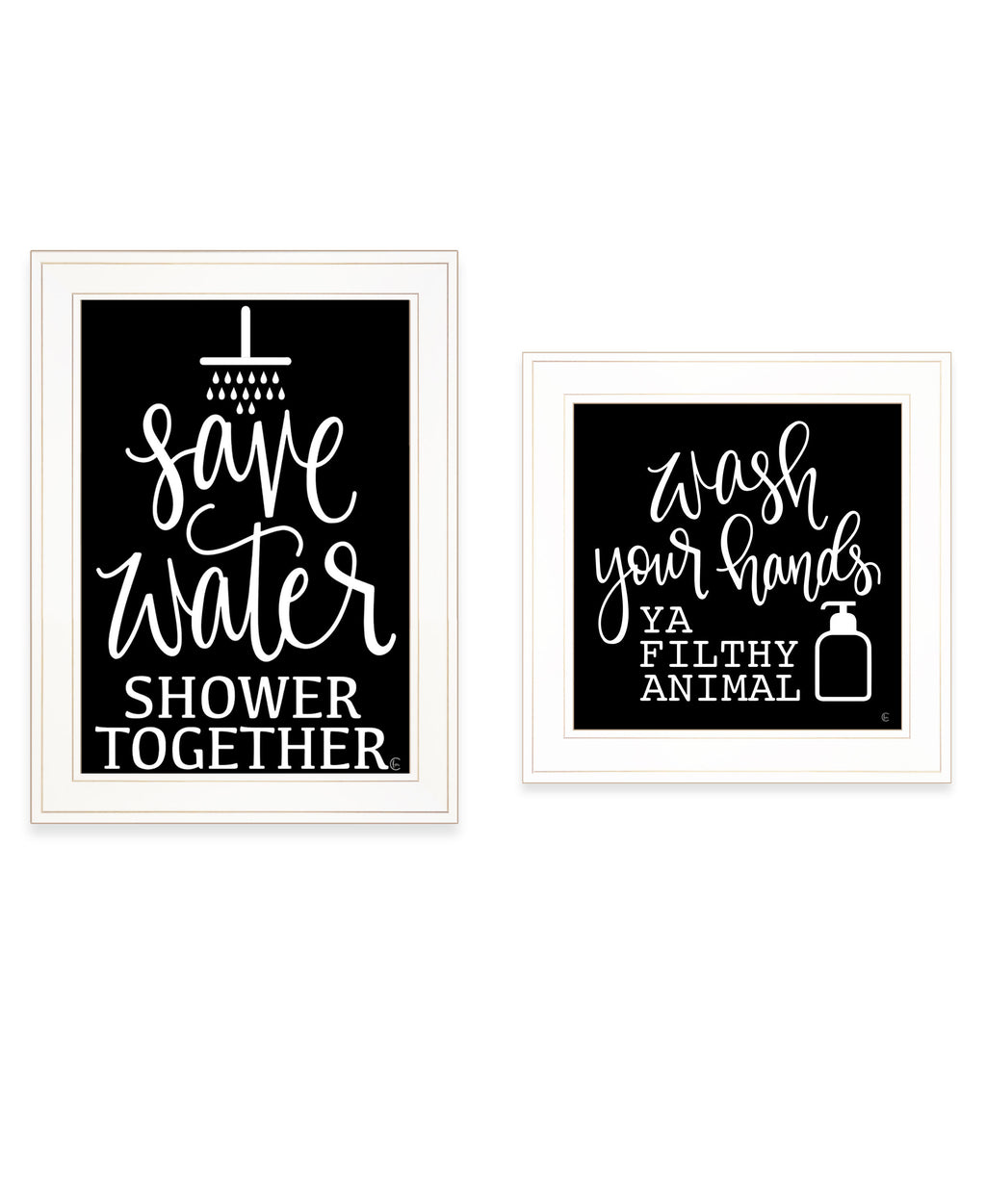 "Wash Up" Vignette is by Artisan Fearfully Made Creations. This 1-15"X19" & 1-15"X19" decorative white framed wall art. This humorous set of typographic black and white print features two image both with script reading "Wash Your Hands YA FILTHY ANIMAL" & "Save Water Shower Together". One has a soap dispenser sitting by the words and the other a showerhead raining the words down. This creative wall art would look adorable in any bathroom location. Our products are proudly made by skilled American workers. The surface of our framed art is textured with a fade resistant coating, so no glass is necessary. A vegetable-based glue is used in the production of our products, and our frames are crafted from 100% recycled material. In keeping with our environmentally friendly approach towards manufacturing. Arrives ready to hang.•Print has fade resistant surface texture, no glass is necessary•Woman Owned Business (WBE)•Arrives ready to hang, no additional hardware needed on item•individually hand crafted by skilled American workers•Cleaning Instructions: Clean with Soft Dry Cloth Only•Made in U.S.A.•Artwork by American Artist