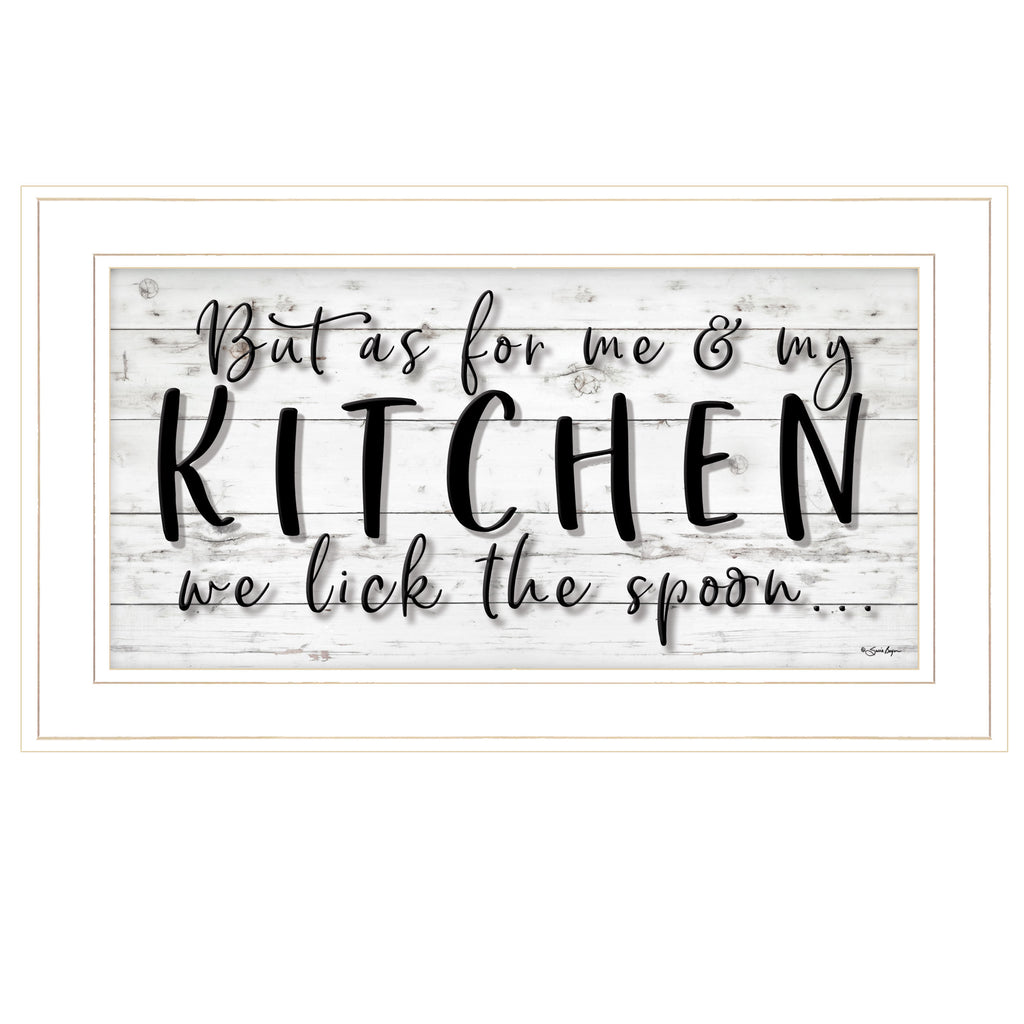 BOY403D-226G "We Lick the Spoon" by Susie Boyer. This white frame 27x15 print would be great for a kitchen with script; saying "But as for me & my Kitchen we lick the spoon". The surface of the art is coated with a fade resistant texture which gives it a canvas-like appearance. No glass is necessary. Arrives ready to hang.•Women Owned (WBE)•Textured Artwork with a 'rolled on' acid free acrylic coating to create a canvas painting effect. No glass is necessary.•UV protectant coating protects artwork from fading.•Molding adds natural beauty to the framed art. Frame is keyholed for ease of hanging.•Frame is keyholed for ease of hanging.