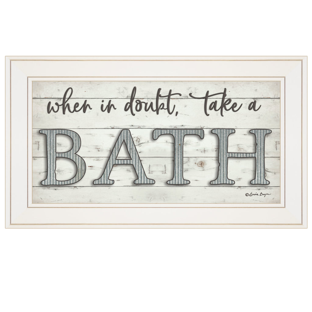 BOY449-226G "When in Doubt Take a Bath" by artisan Susie Boyer. This decorative white framed 1-pc (21x12) of print for the bathroom: When in doubt, take a Bath! These have white custom made frames; Framed print has a UV coating (glass is not needed) and arrives ready to hang. Made in USA. •Women Owned (WBE)•Textured Artwork with a 'rolled on' acid free acrylic coating to create a canvas painting effect. No glass is necessary.•UV protectant coating protects artwork from fading.•Molding adds natural beauty to the framed art. Frame is keyholed for ease of hanging.•Frame is keyholed for ease of hanging.
