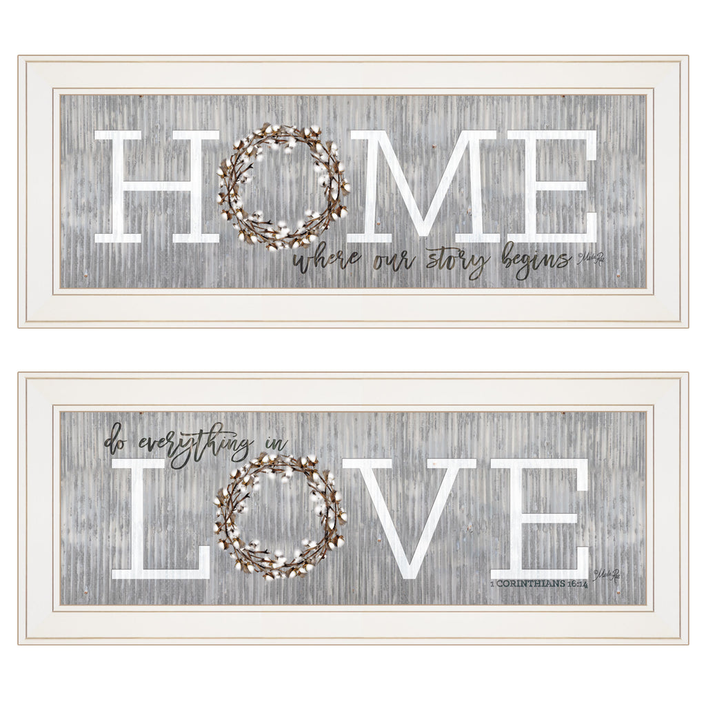 "Where Our Story Begins" by artist Marla Rae. This decorative white framed vignette of 2-27"x11" size of printed on paper to look like metal with words "Home" & "Love". Framed print has a UV coating (glass is not needed) and arrives ready to hang.•TEXTURED ARTWORK with a 'rolled on' acid-free acrylic coating to create a canvas painting effect.•UV PROTECTANT COATING protects artwork from fading. No glass is necessary.• MOULDING adds natural beauty to the framed art. Frame is keyholed for the easy hanging.•THIS FINE HOME DECOR piece made in the USA by Woman Owned Business (WBE) is a perfect gift for a friend or relative.