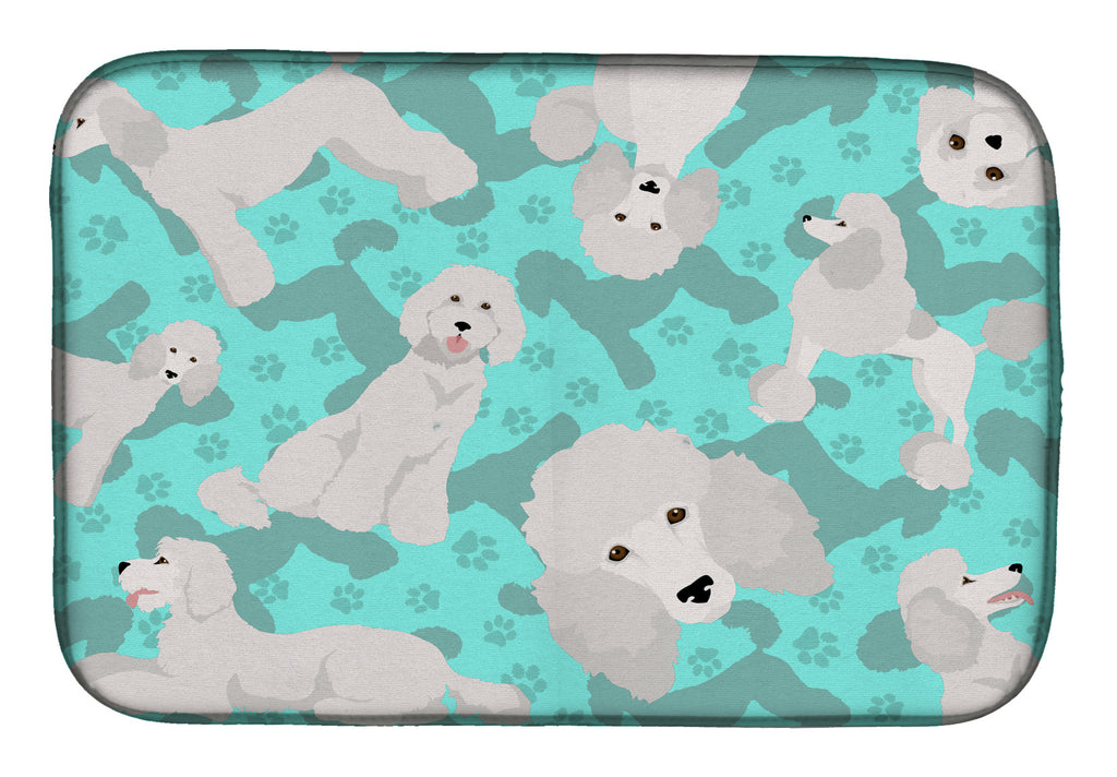 Dish Drying Mat featuring breed specific Poodle artwork. Say goodbye to messy countertops and soggy dish towels with our innovative dish drying mat. Our high-quality dish drying pad is designed to keep your countertops dry while offering a stylish and efficient solution. Whether you're air drying dishes, glasses, stemware, silverware, pots, pans, bottles, or even fruits and vegetables, our dish mat is the perfect choice. The 14 inches x 22 inches size fits most counters and dish drying racks, and the non-slip design ensures stability. Made with water-absorbent polyester and a polyurethane foam insert, our dish drying mat is not only functional but also durable. It's machine washable and printed in the USA for long-lasting use. The beautiful artwork adds flair to your kitchen decor, making it a perfect housewarming gift or present for any occasion. Upgrade your kitchen experience with our absorbent and versatile dish drying mat.