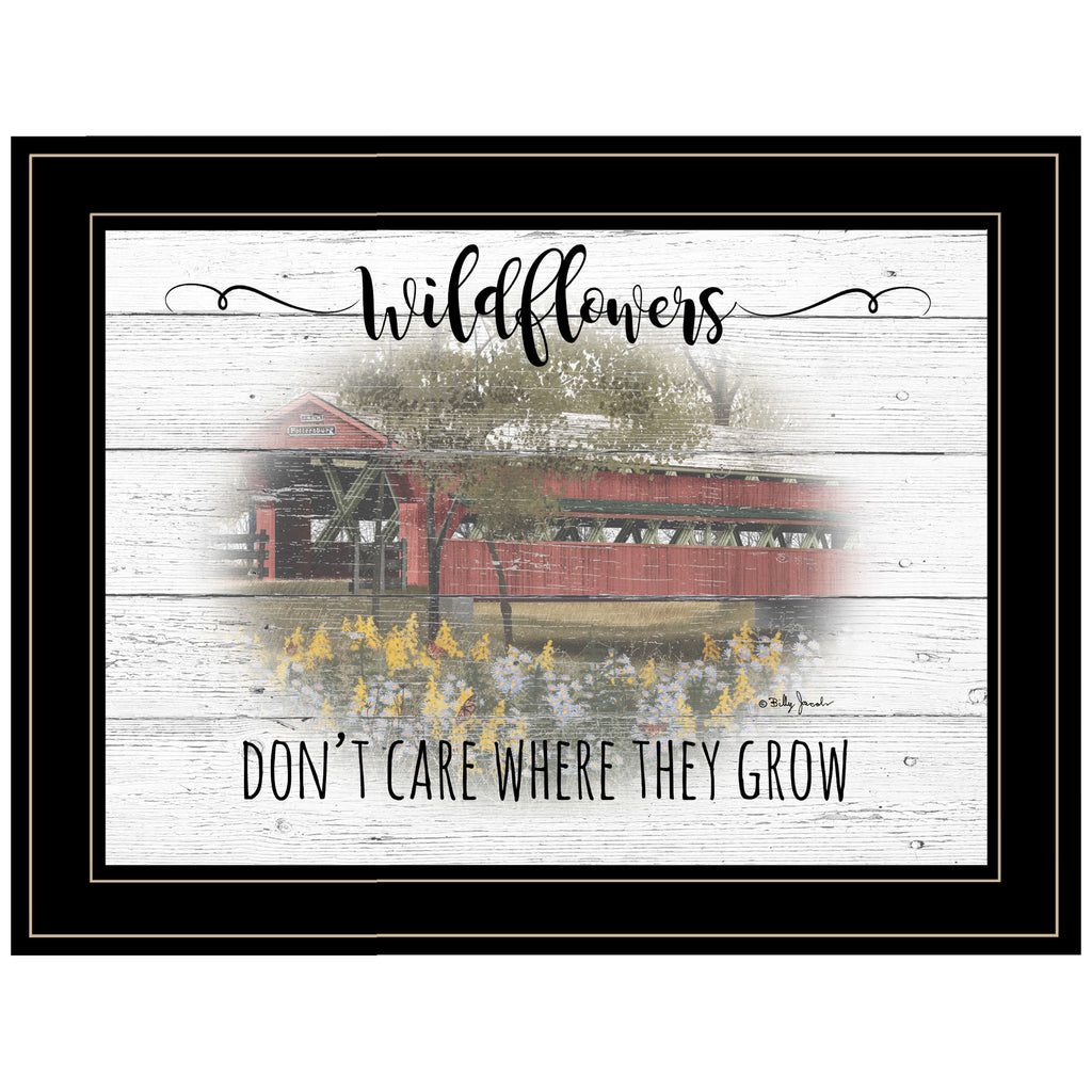 BJ1217-704G "Wildflowers" by artisan Billy Jacob, in a decorative grooved (19x15) black frame. This art features a covered bridge, with flowers and trees surrounding it, wooden background of shiplap. The script on the print says "Wildflowers - don't Care Where they Grow!. This piece of artwork is done by the famous Ohio artisan Billy Jacobs. The surface of the print is textured with a fade resistant coating so no glass is necessary. Arrives ready to hang. Made in the USA by skilled American workers. •Textured Artwork with a 'rolled on' acid free acrylic coating to create a canvas painting effect. No glass is necessary.•Surface of the print has a fade resistant coating.•Arrives Ready to Hang•Woman Owned Business (WBE)•Handmade in the USA•Decorative Moulding adds natural beauty to the framed art.