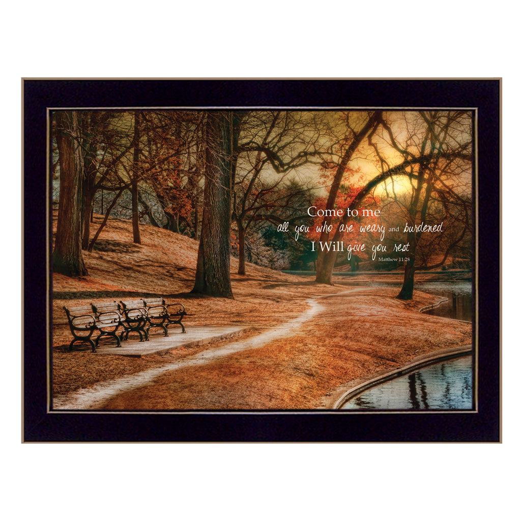 "I Will Give You Rest" by artist Robin-Lee Vieira. This decorative black framed print 18"x14" of a tree lines park path with park benches along a pond; script that says "Come to me, all you who are weary and burdened; I will give you rest". •TEXTURED ARTWORK with a 'rolled on' acid-free acrylic coating to create a canvas painting effect.•UV PROTECTANT COATING protects artwork from fading. No glass is necessary.• MOULDING adds natural beauty to the framed art. Frame is keyholed for the easy hanging.•THIS FINE HOME DECOR piece made in the USA by Woman Owned Business (WBE) is a perfect gift for a friend or relative.