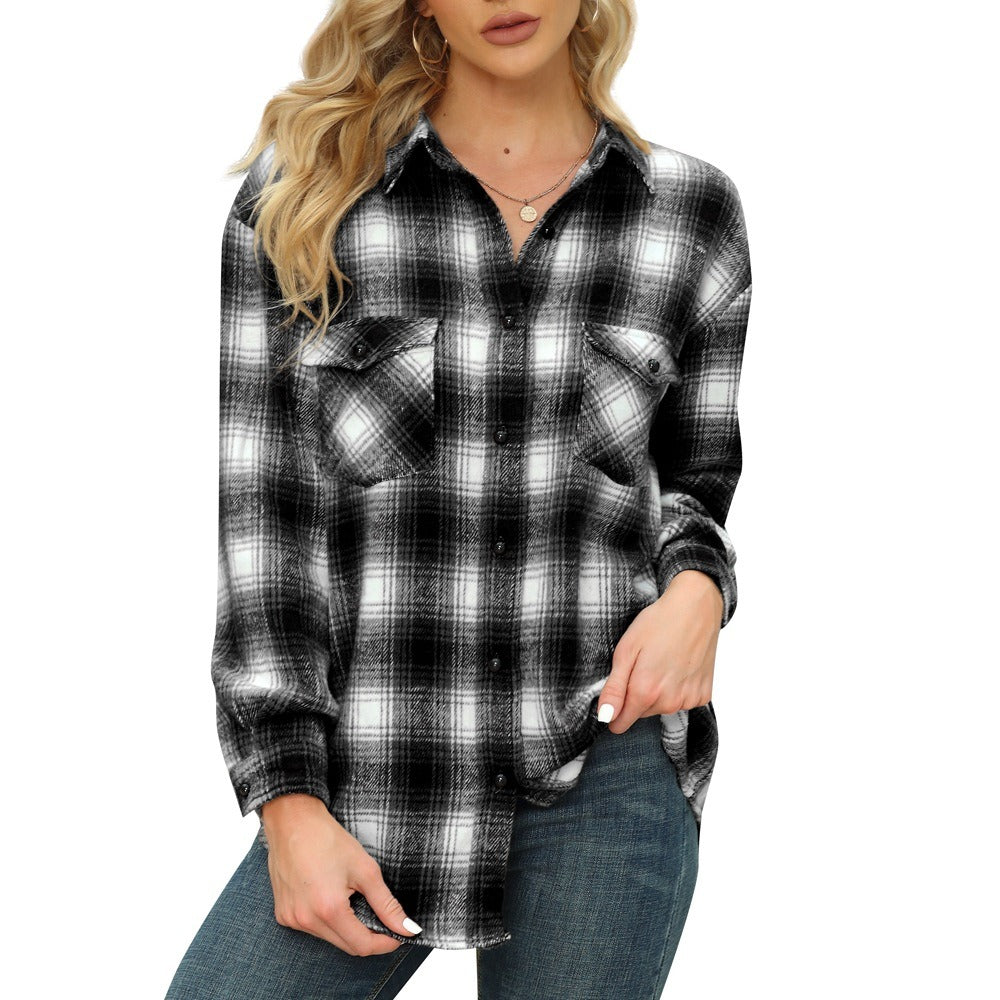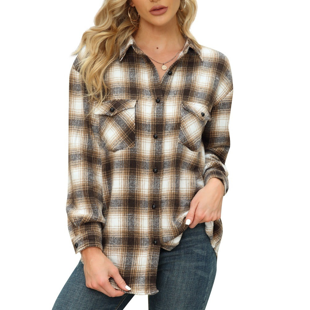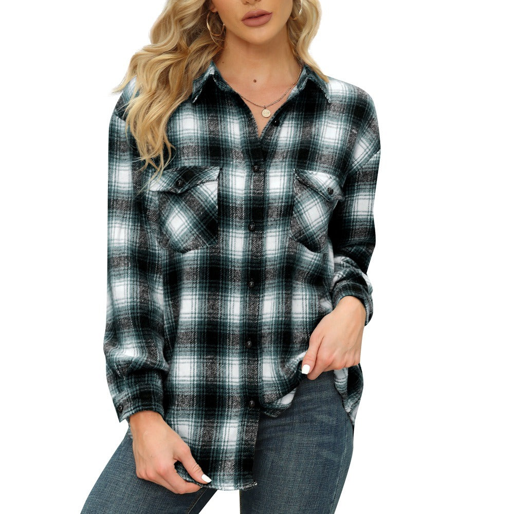 [Feature]-The flannel shirt,Button front top,Collared,Plaid print,Two pocket,Single button on cuff,Oversized fit,Drop shoulder,Unlined.