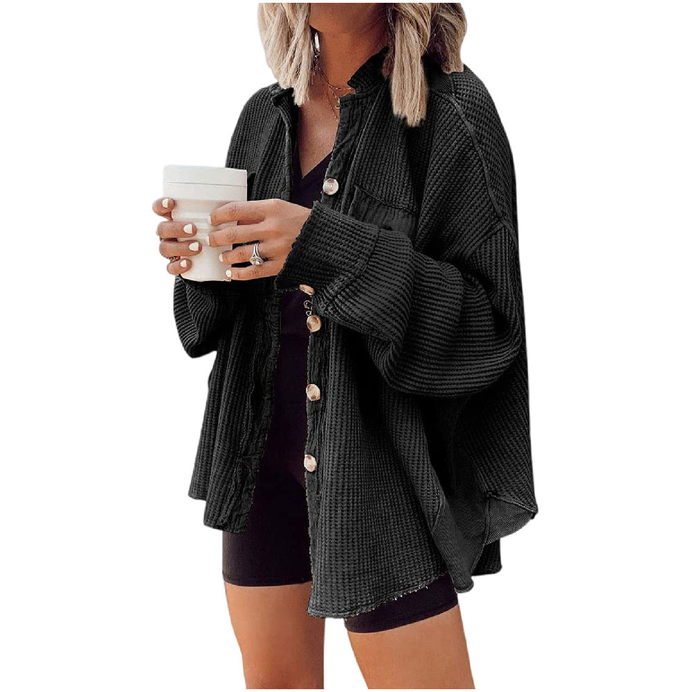 1.Womens Waffle Knit Shacket Boyfriend Jacket Long Sleeve Button Down Shirt Blouse Tops