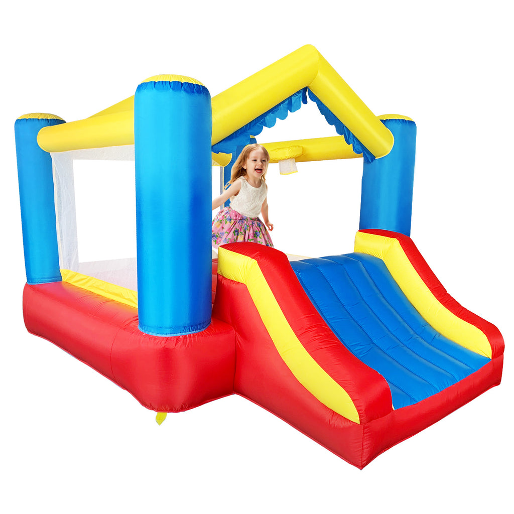 1.The inflated size of the bounce house is 12 ft L x 9 ft W x 8 ft H. The size of the jumping area is: 9 ft x 9 ft, the jumping surface is 20" high from the ground, and the 3 ft x 6 ft large slide, basketball hoop. Can withstand a maximum weight of 400 lb, with a maximum weight of 100 lb for a single