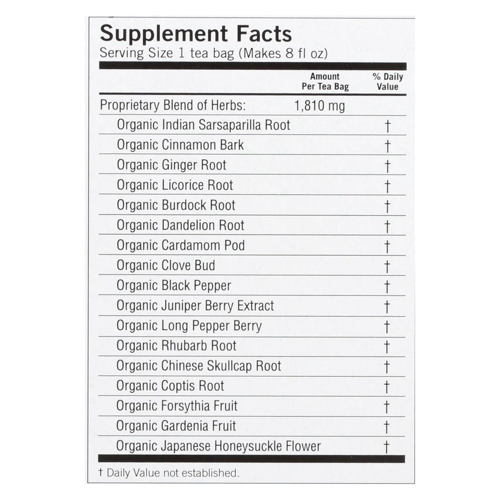 Yogi spicy - sweet detox is packaged in 16 tea bags, each of which will make an 8 fl. Oz. Cup of herbal tea. Steep your tea bag in hot water for 7 minutes. Ingredients include cleansing herbs burdock and dandelion, as well as juniper berry, indian sarsaparilla, licorice, cinnamon and other ingredients. This spicy - sweet tea is kosher, non-gmo, organic and contains caffeine. The oxygen-bleached tea bags are compostable.