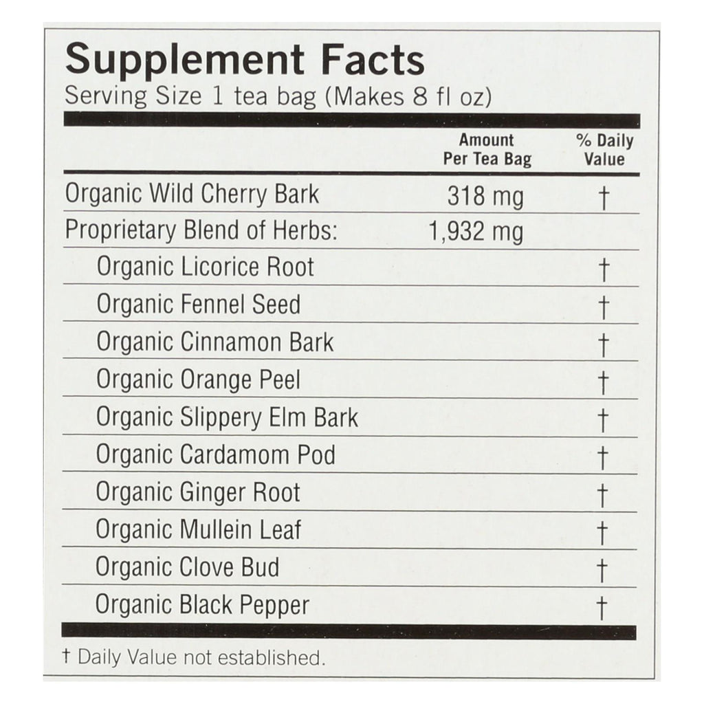 Yogi throat comfort is packaged in 16 tea bags, each of which will make an 8 fl. Oz. Cup of herbal tea. Steep your tea bag in hot water for 7 minutes. This beverage was formulated to relieve minor throat irritation. It's all-organic ingredients include wild cherry bark, slippery elm bark, licorice root, fennel seed and orange peel. The oxygen-bleached tea bags of this caffeine-free, non-gmo and kosher tea are compostable.